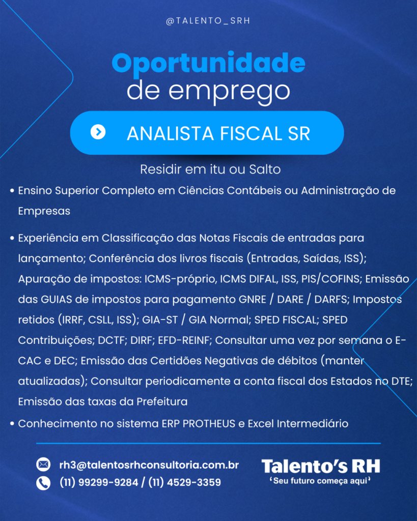 ANALISTA FISCAL SR Em Vagas CANDIDATE-SE ABAIXO Primeiro Nome *Nome do meioE-mail *Telefone *ADICIONE O SEU CURRÍCULO AQUI! *Selecione ArquivoNenhum arquivo selecionado aindaDeletar arquivo enviadoPARA QUAL VAGA DESEJA SE CANDIDATAR? *0 / 180Enviar mensagem