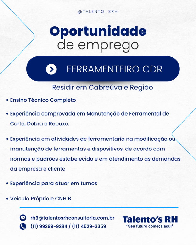 Ferramenteiro CDR Em Vagas CANDIDATE-SE ABAIXO Primeiro Nome *Nome do meioE-mail *Telefone *ADICIONE O SEU CURRÍCULO AQUI! *Selecione ArquivoNenhum arquivo selecionado aindaDeletar arquivo enviadoPARA QUAL VAGA DESEJA SE CANDIDATAR? *0 / 180Enviar mensagem