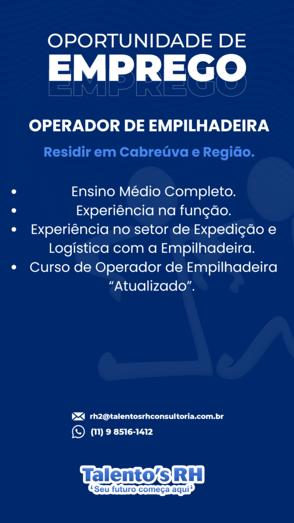 OPERADOR DE EMPILHADEIRA Em Vagas CANDIDATE-SE ABAIXO Primeiro Nome *Nome do meioE-mail *Telefone *ADICIONE O SEU CURRÍCULO AQUI! *Selecione ArquivoNenhum arquivo selecionado aindaDeletar arquivo enviadoPARA QUAL VAGA DESEJA SE CANDIDATAR? *0 / 180Enviar mensagem