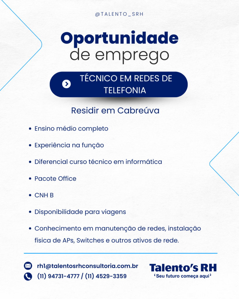 TÉCNICO EM REDES DE TELEFONIA Em Vagas CANDIDATE-SE ABAIXO Primeiro Nome *Nome do meioE-mail *Telefone *ADICIONE O SEU CURRÍCULO AQUI! *Selecione ArquivoNenhum arquivo selecionado aindaDeletar arquivo enviadoPARA QUAL VAGA DESEJA SE CANDIDATAR? *0 / 180Enviar mensagem
